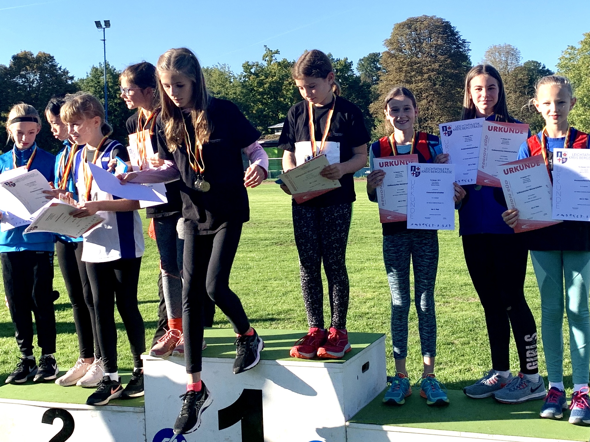 Bei den U12-Athleten und Athletinnen waren schon einige Erfahrungen und Erfolge zuletzt aus dem Jahr 2020 auf die anspruchsvolle Strecke von 1.250m zu sehen. Ganz neu dabei und sehr kämpferisch zeigte sich Cora Fenrich in der bisherigen Vereinsbestzeit von 5:00min. Sie führte das Feld z.T. an, musste nur eine Läuferin aus einer anderen Jahrgangsgruppe ziehen lassen, doch behielt sie den 1. Rang in der Altersklasse W11. Ebenso ein gutes Rennen liefen Jona Kropsch, 5:35min, Marisa Ferreira, 5:41min, Luise Owietzka, 5:56min und belegten die Plätze 6 bis 8.Die Mannschaftswertung ergab dann die Bronzemedaille für Fenrich, Kropsch und Ferreira. Die W/M10 mussten erstmals auch diese große Mörlenbach-Runde mit ihren leichten Steigungen bewältigen. Hier kamen Paul Rasenat in guter Zeit von 5:29min auf den 5. Platz, Alp Inceoglu in 6:10min auf den 8. Platz. Julia Lange schaffte die Runde in 5:47min, Rang 8 und Lia Hühn in 6:02min auf Rang 12.