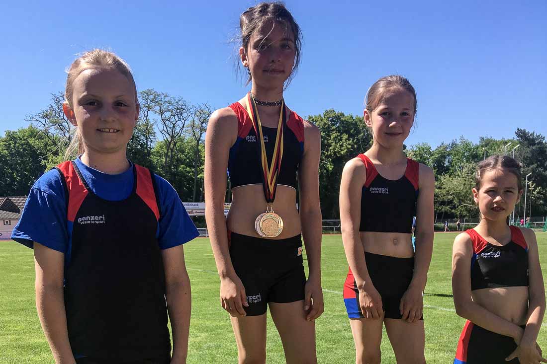 Lena Porsch erreichte in der Altersklasse W11 drei persönliche Bestleistungen und 2 Titel: Sie sprang in ihrem 4.Durchgang 4,20m weit, schaffte mit einer Höhe von 1,23m den 2. Platz und sprintete die 50m im Endlauf in 7,67sec., nachdem sie bereits souverän den Vorlauf gewann. Das bedeutete Goldmedaillen im Sprint und Weitsprung.J ohanna Granzner warf bei sehr wechselhaften Windbedingungen den 80gr. Schlagball auf sehr gute 25,50m und holte sich damit ebenfalls den Kreismeistertitel. Auch sie konnte sich im Finalsprint auf die 50m noch steigern und erreichte hier mit 8,68sec. den 3. Rang in der Altersklasse W10. In der gleichen Mannschaft bestritt Lena Jochim ebenfalls ihren ersten Dreikampf, verbesserte sich in jeder Disziplin und schaffte zwei 10. Plätze im Weitsprung und Sprint sowie den 8. Platz im Wurf.