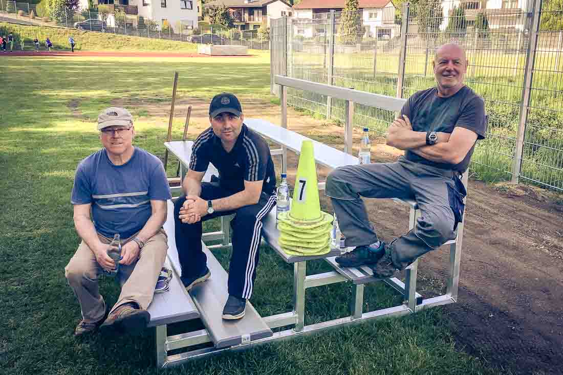 Dank einer großzügigen Zuwendung durch die Dietmar-Hopp-Stiftung konnte der TV Reisen sinnvolle Investitionen auf dem von ihm genutzten Gelände oberhalb der Südhessenhalle vornehmen. Der Zaun um das Gelände wurde erneuert. Die Weitsprunggruben erhielten neue Abdeckungen und es wurde zwei portable Tribünen angeschafft, die vielseitig genutzt werden. Die ganze Maßnahmen war allerdings nicht ohne Eigenhilfe machbar. Den Vorstandsmitgliedern Hans Günter Dörsam (links) und Hans-Peter Hartmann (rechts) war es immer wieder gelungen, Sportkameraden aus dem Kreis der Alt Herren Handballer für Arbeitseinsätze zu gewinnen. Das Bild entstand beim Frühjahrsputz auf der Anlage. Eine der Tribünen bestand dabei den Praxistest.