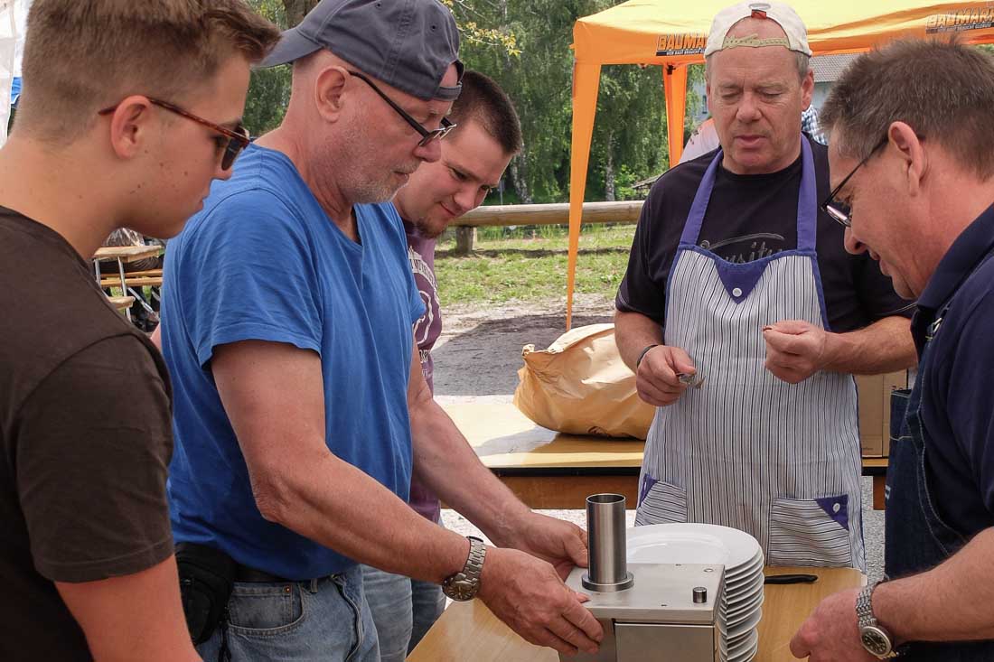 Das Vereinsportfest des TV Reisen, der Tag der Bewegung und Begegnung fand in diesem Jahr bereits vor den Sommerferien am letzten Maiwochenende statt. Nach einem ansprechenden Gottesdienst der neuen Pfarrerin Isabell Borck und Wolfgang Grün starteten die Wanderer direkt an der Oase der Stille und die Vereinskinder führten ihre Bewegungswettbewerbe auf dem Sportgelände durch. Die Tanzgruppen und Informationen zum Fitnessangebot bereichterten die Mittagszeit. Abgerundet wurde der Tag durch ein Bouleturnier und Spaßwettkämpfe von insgesamt 6 Mannschaften in ungewohnten Disziplinen. Das Programm wäre ohne ehrenamtliches Engagement von sehr vielen Menschen überhaupt nicht möglich – Das Bild zeigt einige Helfer, die unter Anleitung von Organisationschef Hans-Peter Hartmann die Geheimnisse der Wurstschnippelmaschine für die Currywurst enträtseln.